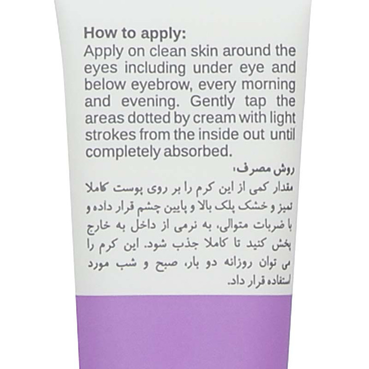 سایر مشخصات: - مناسب انواع پوست- سفت کنندهی پوست- ترمیم عمیق چروکهای ریز دور چشم- بهبود گردش خون مویرگی پوست اطراف چشم- فاقد پارابن