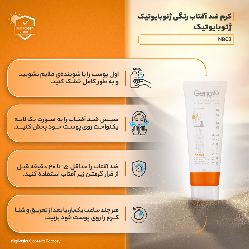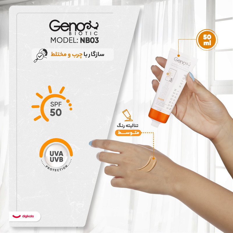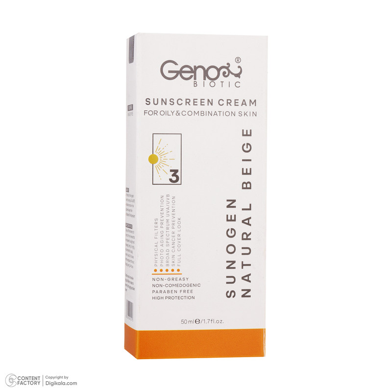 کرم ضد آفتاب مخصوص پوست چرب بژ طبیعی ژنوبایوتیک، با محافظت قوی پوست از لایههای اپیدرم پوستی و برخورداری از خاصیت آنتی باکتریال و ضدالتهاب بصورت یکی از بهترین ضدآفتابهای موجود در بین تولیدات داخلی معرفی شده که با برخورداری از فیلترهای UVA و UVB و IR از پوست در برابر اشعههای مضر و پیری پوست محافظت میکند. این محصول با ساختار سبک و بدون چربی در برابر تعریق و آب مقاوم بوده همچنین با پوششدهی مناسب همانند کرمپودر گزینهی مناسبی برای پوست چرب، مختلط و آکنهای محسوب میشود. کرم ضد آفتاب مخصوص پوست چرب بژ طبیعی Geno Biotic، با افزایش رطوبترسانی پوست بهترین راه برای جلوگیری از ایجاد چین و چروک و حفظ شادابی پوست شناخته شده همچنین با ترکیبات موثری همچون عصاره آفتابگردان، گل مغربی، آلوئهورا و ویتامین E لایهای محافظ روی پوست ایجاد میکند که با جذب سریع با خنثی کردن اثرات مضر رادیکالهای آزاد از بروز لکهای پوستی پیشگیری میکند.