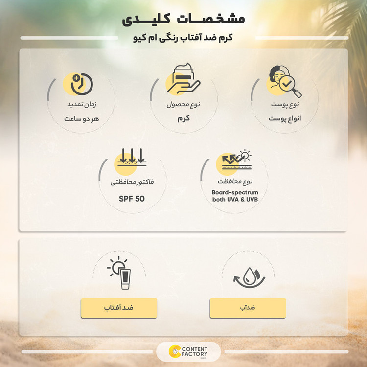 محصولات MQ ساخته شده از مواد با کیفیت می باشد. این محصولات در یکی از معتبرترین لابراتوارهای فرانسه و زیر نظر اساتید فن در صنعت مراقبت از پوست و مو فرموله شده است. این کمپانی کرم های ضد آفتاب خود را روانه بازار کرده است که ساخته شده از مرغوبترین و جدیدترین مواد اولیه و دارای حداکثر حفاظت در برابر پرتوهای مضر آفتاب هستند. این محصولات دارای ساختاری سبک بوده نرمی و لطافت را به پوست بازمی گرداند. یکی از این محصولات بسیار با کیفیت این برند، کرم ضد آفتاب بایوتچ SPF 50 است. که در سه رنگ بژ طبیعی، بژ روشن و بدون رنگ موجود است. که قويترين و موثرترین ضدآفتاب با دو عملکرد (ضدآفتاب + ضدلک) است و مناسب برای پوست های دارای لک همراه با خاصیت روشن کنندگی می باشد. لذا انواع لک، کک ، لک های ناشی از آفتاب، جای جوش،بارداری و افزایش سن را برطرف می کند. همچنین از ایجاد لک خصوصا در افرادی که مستعد ابتلا به لک های ناشی از آفتاب هستند، پیشگیری می کند. و علاوه بر این محافظ قوی پوست در برابر تاثیرات مخرب اشعه های مضر UVA و UVB به حساب می آید. و با خاصیت مرطوب کنندگی و التیام بخشی برای انواع پوست مناسب است. جهت استفاده نیم ساعت قبل از قرار گرفتن در معرض اشعه آفتاب روی پوست تمیز مالیده شود و هر دو ساعت یکبار آن را تجدید کنید.