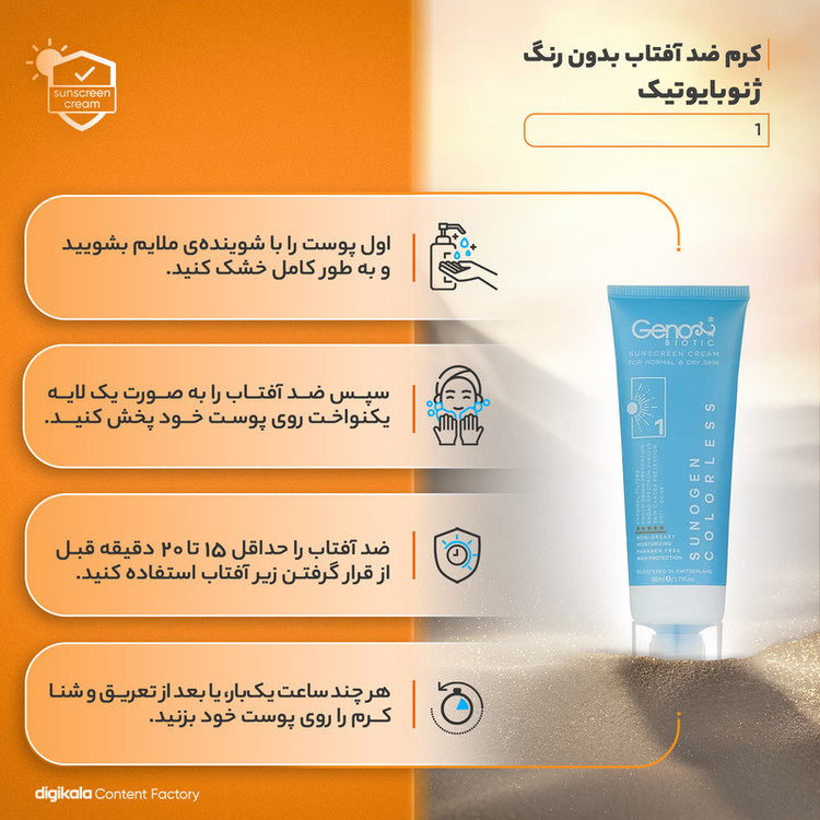 20 دقیقه قبل از قرار گرفتن در معرض آفتاب استفاده نموده و هر 3-4 ساعت یکبار آن را تجدید نمایید.