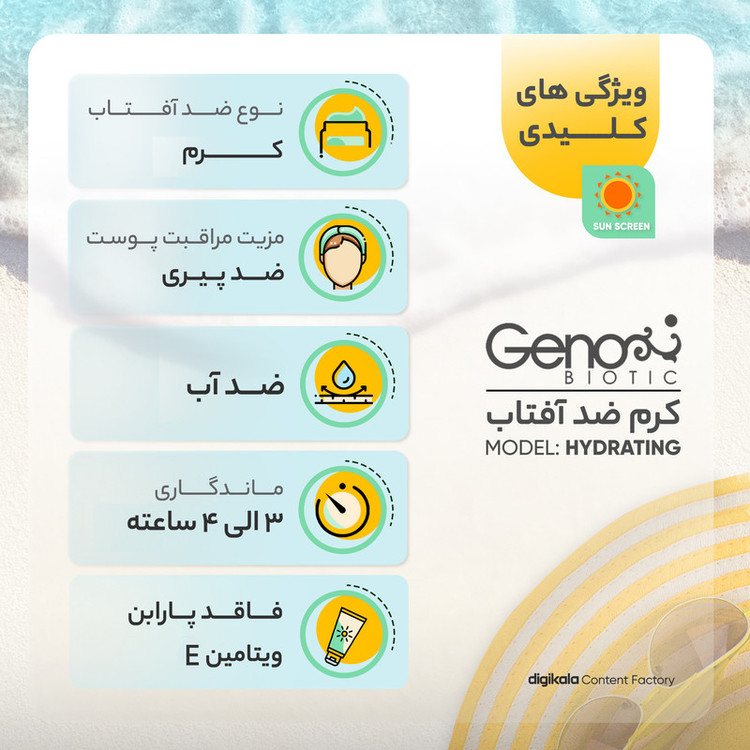 ضد آب , محافظت کننده در برابر اشعه UVA , محافظت کننده در برابر اشعه UVB , مرطوب کننده , فاقد پارابن