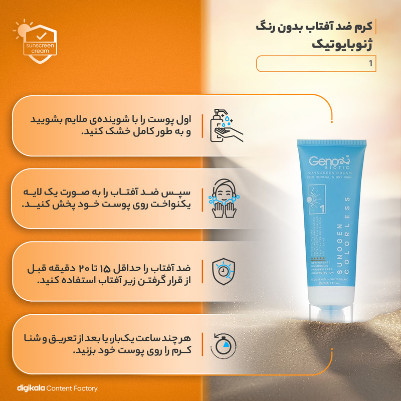 راهنمای استفاده : 20 دقیقه قبل از قرار گرفتن در معرض آفتاب استفاده نموده و هر 3-4 ساعت یکبار آن را تجدید نمایید.