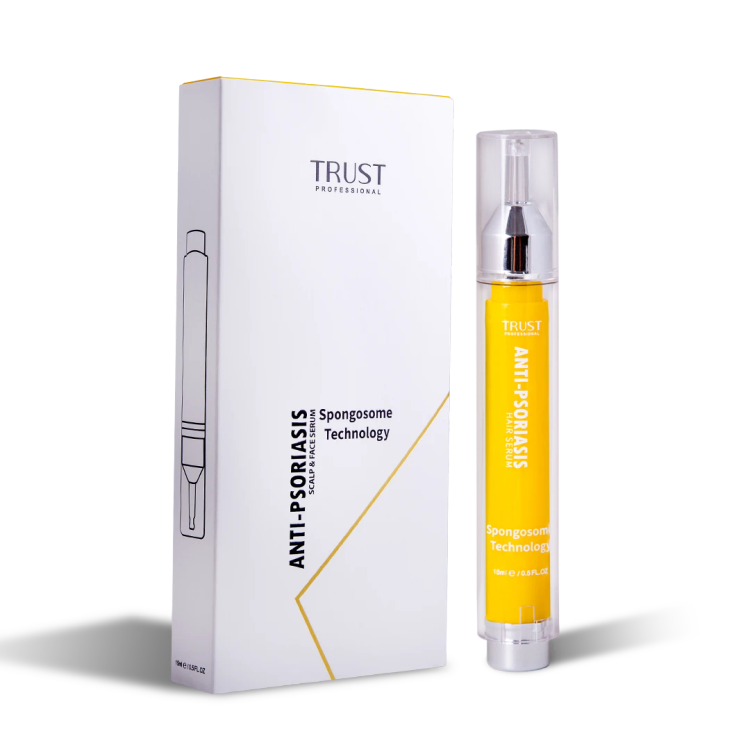 پسوریازیس نوعی بیماری خودایمنی پوستی است که راشها یا پلاکهای پوستی و ضایعاتی را در پوست سر، صورت، زانوها، بازوها و قسمت بالا تنه ایجاد کرده و به عنوان یک بیماری مزمن و بلند مدت شناخته میشود. این پلاکها دردناک هستند و با داشتن یک سیکل مشخص به مدت چند هفته تا چند ماه بروز پیدا کرده و پلاکهایی که رنگ متغیری دارند معمولا به صورت پوستههای صورتی تا قرمز بروز پیدا میکنند. این بیماری با علایم مختلفی مثل خشکی پوست با خونریزی، خارش و سوزش همراه است. پسوریازیس نواحی مختلفی از بدن را درگیر میکند که یکی از مهمترین قسمتها پوست سر و صورت است. شیوع پسوریازیس در پوست سر و صورت منجر به خشکی پوست شده و در نهایت باعث آسیب پوست و شکنندگی و ریزش موها میشود. بنابراین برای کنترل علایم پسوریازیس میبایست از محصولات مراقبتی مناسب استفاده کرد. سرم بهبود دهنده پسوریازیس تراست با بهرهگیری از تکنولوژی اسپانجوزوم به طور موثری به نفوذ و رهاسازی پیوسته ترکیبات لایهبردار و بهبود دهنده ساخت سلولهای جدید در پوست سر و صورت کمک کرده و با بهبود پلاکهای پسوریازیس و کاهش علایم بیماری، سلامت پوست را حفظ میکند. این محصول با دارا بودن ترکیبات موثره آبرسان و ضد التهاب، از خشکی پوست سر و صورت جلوگیری کرده و با مهار واسطههای التهابی، از پیشرفت عارضه جلوگیری کرده و کمک شایانی به بهبود ضایعات پسوریازیس میکند.
