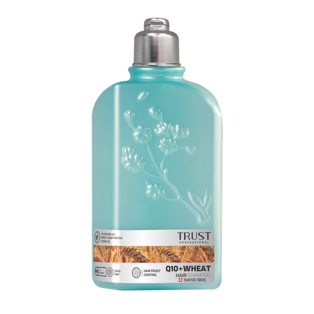 شامپو سر جوانه گندم و Q10 تراست، با داشتن پروتئین جوانه گندم، روغن جوجوبا و کوآنزیم کیوتن، از وز شدن تارهای موی شما جلوگیری کرده و حالت فر موهای شما را حفظ میکند. همچنین با استفاده از این محصول، تارهای مو و پوست سرتان آبرسانی شده و از خشکی آنها جلوگیری میشود.