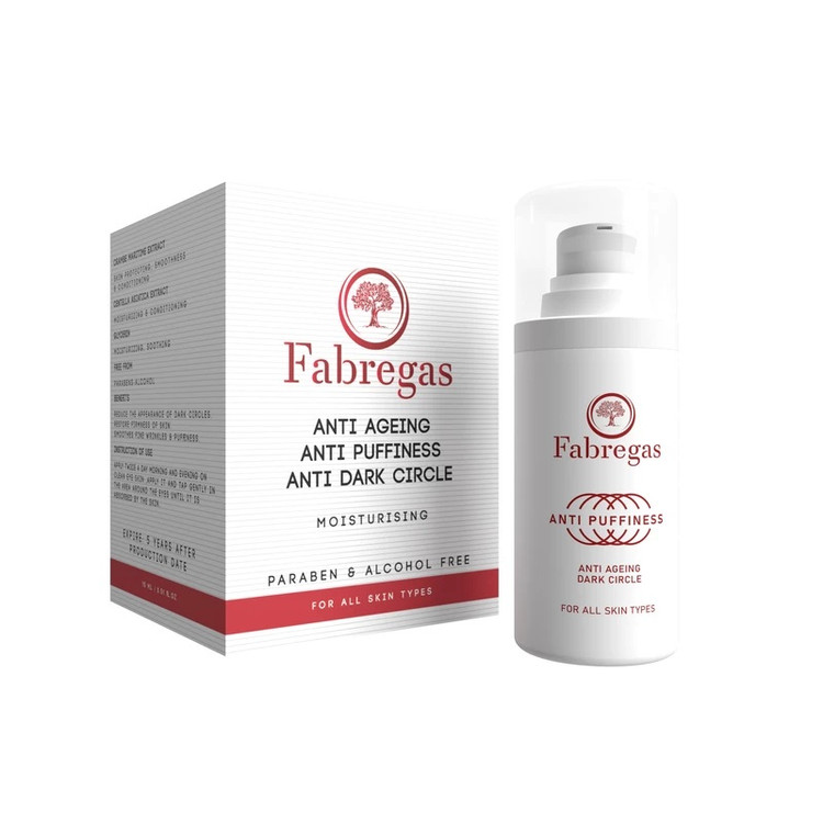 چشمها اصلی ترین فاکتور زیبایی و جذابیت چهره هستند و پوست اطراف چشم، حساس ترین بخش پوست بدن است. کار زیاد، خواب کم، کمبود آب بدن، اخم کردن، جمع کردن چشمها در نور زیاد و حتی عوامل روحی موجب ایجاد و تشدید چین و چروک، تیرگی و پف در اطراف چشم شده و زیبایی و شادابی چهره را کمرنگ می کند و موجب پیری زودرس در چهره می شود؛ از این رو استفاده از یک کرم دور چشم از سن 20 سال به بالا ضروریست. مواد موثر موجود در کرم دور چشم فابریگاس علاوه بر افزایش میزان کلاژن و الاستین، باعث تقویت غشای مویرگی پوست شده و در نتیجه موجب شفاف شدن، شادابی و جلوگیری از پیری پوست می گردد. عصاره گیاه سنتلا آسیاتیکا: افزایش دهنده 57 درصدی تکثیر سلولی و سنتز کلاژن در پوست است و در نتیجه مقاومت کششی و ترمیم سلول های پوست را افزایش می دهد. همچنین حاوی آنتیاکسیدانها و ساپونینها بوده که برای التیام ظاهر پوست و از بین بردن خطوط و لکههای پوستی موثر می باشد. عصاره گیاه کرن بری: منبع عالی آنتی اکسیدان، ویتامین C-B3-B5 است و پوست را بازسازی، مرطوب و روشن می کند. مسئولیت محافظت از پوست در برابر عوامل ایجاد چین و چروک و تیرگی را بعهده دارد و فرآیند پیری را کند میکند. گلیسیرین: جاذب رطوبت، درخشان کننده و نرم کننده قوی پوست است.