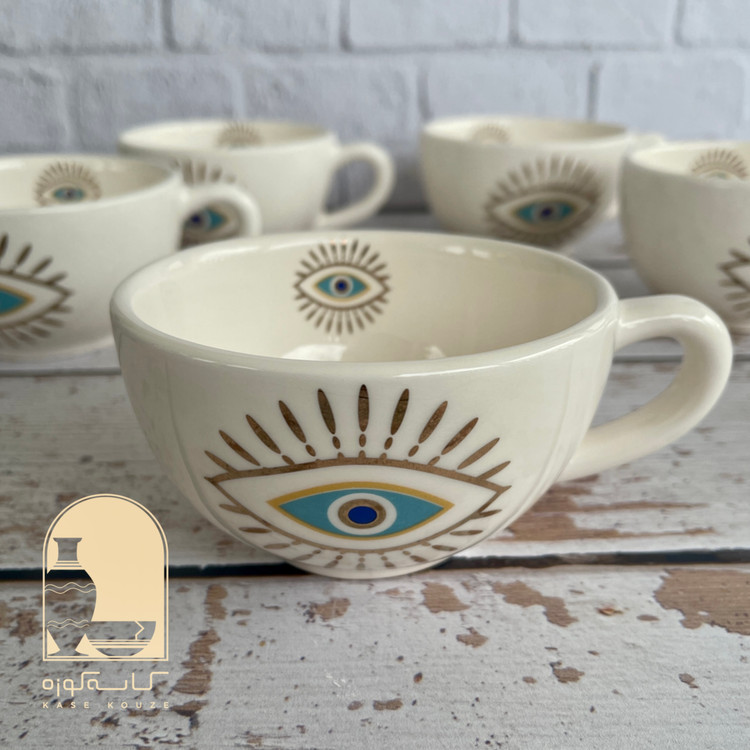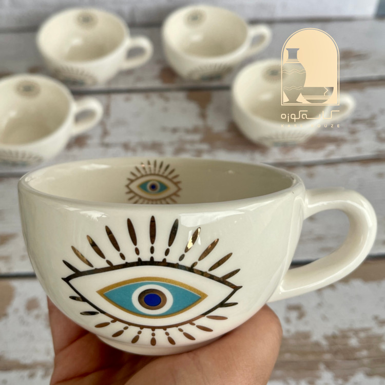 فنجان سرامیکی چشم نظر نظر تزئین شده با طلای 11 عیار در لبه های فنجان . این محصول دست ساز میباشد 3 مرحله در کوره و در دمای 1100 درجه پخت شده و با تحمل شک حرارتی بالا این محصول رنگ . لعاب . طرح و نقش ثابت و کاملا براق و با کیفیت می باشد این محصول قابل شستشوی است و این محصول بدون کوچکنرین لب پری و ترک و لک میباشد و کاملا براق است
