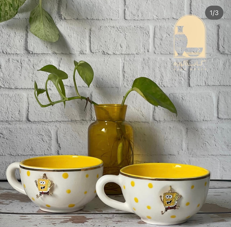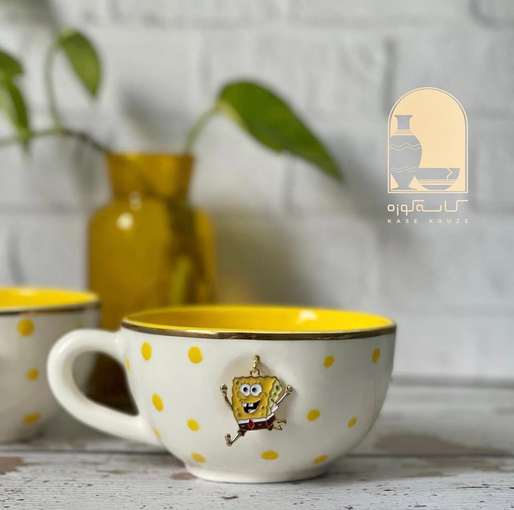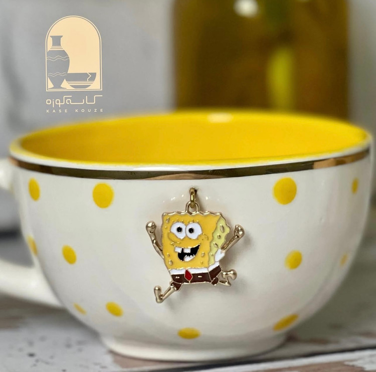 فنجان سرامیکی آویز باب اسفنجی تزئین شده با طلای 11 عیار در لبه های فنجان . این محصول دست ساز میباشد 3 مرحله در کوره و در دمای 1100 درجه پخت شده و با تحمل شک حرارتی بالا این محصول رنگ . لعاب . طرح و نقش ثابت و کاملا براق و با کیفیت می باشد این محصول دارای یه پلاک آویزباب اسفنجی میباشد که قشنگی آن را چند برابر کرده این محصول قابل شستشوی است و این محصول بدون کوچکنرین لب پری و ترک و لک میباشد و کاملا براق است