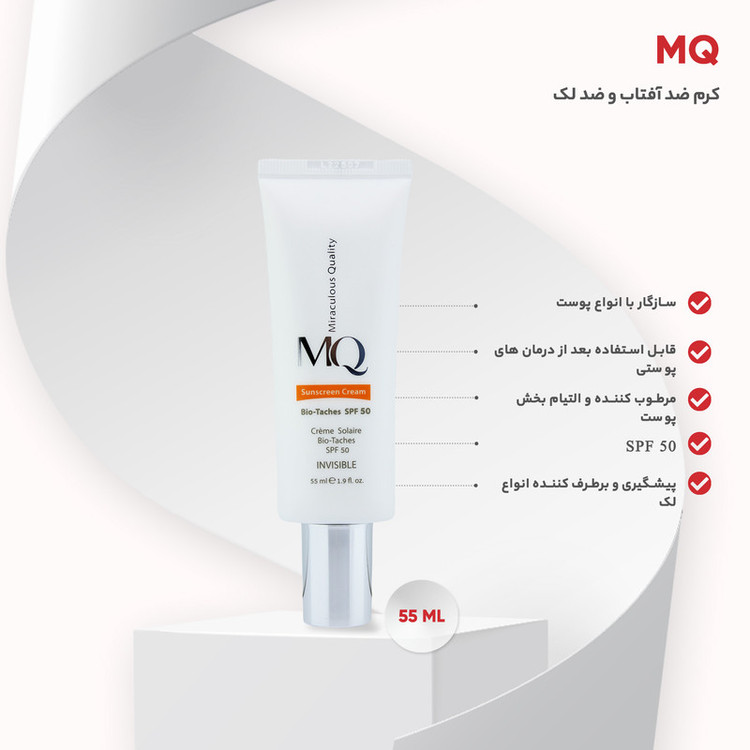 محصولات MQ ساخته شده از مواد با کیفیت می باشد. این محصولات در یکی از معتبرترین لابراتوارهای فرانسه و زیر نظر اساتید فن در صنعت مراقبت از پوست و مو فرموله شده است. این کمپانی کرم های ضد آفتاب خود را روانه بازار کرده است که ساخته شده از مرغوبترین و جدیدترین مواد اولیه و دارای حداکثر حفاظت در برابر پرتوهای مضر آفتاب هستند. این محصولات دارای ساختاری سبک بوده نرمی و لطافت را به پوست بازمی گرداند. یکی از این محصولات بسیار با کیفیت این برند، کرم ضد آفتاب بایوتچ SPF 50 است. که در سه رنگ بژ طبیعی، بژ روشن و بدون رنگ موجود است. که قویترین و موثرترین ضدآفتاب با دو عملکرد (ضدآفتاب + ضدلک) است و مناسب برای پوست های دارای لک همراه با خاصیت روشن کنندگی می باشد. لذا انواع لک، کک ، لک های ناشی از آفتاب، جای جوش،بارداری و افزایش سن را برطرف می کند. لذا قابل استفاده بعد از درمان های پوستی مانند لیزر، میکرودرم، پیلینگ شیمیایی و ...است همچنین از ایجاد لک خصوصا در افرادی که مستعد ابتلا به لک های ناشی از آفتاب هستند، پیشگیری می کند. و علاوه بر این محافظ قوی پوست در برابر تاثیرات مخرب اشعه های مضر UVA و UVB به حساب می آید. و با خاصیت مرطوب کنندگی و التیام بخشی برای انواع پوست مناسب است.جهت استفاده نیم ساعت قبل از قرار گرفتن در معرض اشعه آفتاب روی پوست تمیز مالیده شود و هر دو ساعت یکبار آن را تجدید کنید.