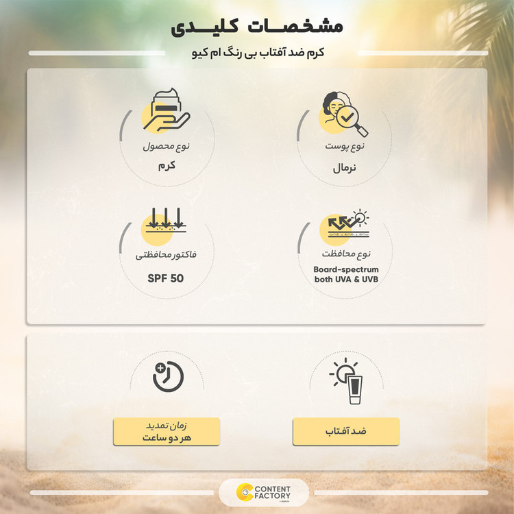 کرم ضد آفتاب بی رنگ پوست نرمال SPF50 ام کیو با ساختاری سبک به سرعت پس از استفاده جذب پوست شده و با ایجاد لایه محافظتی بر روی پوست، مانع از تخریب سلولهای پوستی توسط نور خورشید خواهد شدترکیبات بکار رفته در فرمولاسیون محصولات ضد آفتاب ام کیو MQ ، برگرفته از مرغوبترین و جدیدترین مواد اولیه با حداکثر حفاظت در برابر اشعه های مضر آفتاب می باشند.کلیه محصولات دارای ساختار سبک بوده و حاوی ترکیبات ضد چروک همراه با رطوبت رسانی قوی به پوست بوده که نرم کننده و لطافت بخش پوست می باشند.