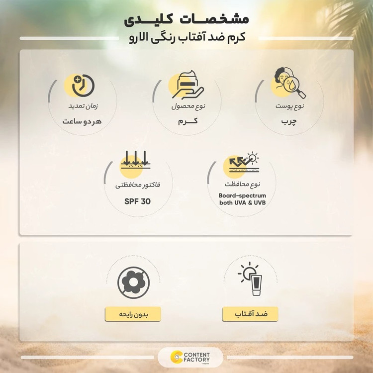مدل «Haute Protection» کرم ضدآفتاب برند «الارو» (Ellaro) سری «Foundation Effect» همانطور که از نامش پیداست دارای اثر کرمپودری است که میتواند هم از پوستتان در برابر اشعههای مضر نور خورشید محافظت کند و هم کاربردی مشابه کرمپودر و آرایشی داشته باشد. رنگ کرم الارو بژ روشن است که برای افرادی که پوستی روشن و حتی گندمی دارند مناسب خواهد بود. ماندگاری ضدآفتاب کرمپودری الارو بالا است و این کرم فاقد پارابن و چربی است و استفاده از آن به افرادی که پوستهای چرب و مستعد جوش دارند توصیه میشود. الارو با دارا بودن SPF30 از پوست صورت در برابر اشعههای UVA و UVB محافظت میکند و مانع از آفتاب سوختگی پوست میشود. SPF30 میزان تقریباً ضعیفی نسبتبه SPFهای بالاتر محسوب میشود و بهتر است افرادی که پوست خیلی حساسی نسبتبه آفتاب ندارند از این SPF استفاده کنند. ضدآفتابهای الارو از نوع کرمپودری و معمولی در حجمها و SPFهای مختلف وجود دارند که از کیفیت بالایی برخوردارند و شما میتوانید نوعی که با پوستتان سازگارتر است را مورداستفاده قرار دهید. حجم کرم ضدآفتاب الارو چهل میلیلیتر است که در تیوپی پلاستیکی گنجانده شده است. کرم الارو دوکاره است و با کیفیت و قیمت مناسبی که دارند یک انتخاب عالی برای خانمها خواهد بود.