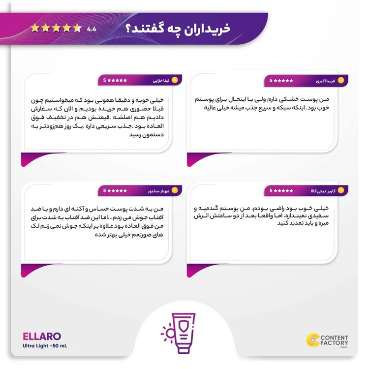 فلوئید ضد آفتاب الارو مدل Ultra Light با حجم 50 میلی لیتر، یک فلوئید ضد آفتاب با SPF 50 است که بسیار سبک و مناسب برای پوست های چرب و مختلط میباشد. این فلوئید ضد آفتاب حاوی فیلترهای محافظتی است که میتواند پوست شما را در برابر اشعههای UVB و UVA محافظت کند و میتواند از جوشها و آکنههای پوستی جلوگیری کند. این فلوئید ضد آفتاب بسیار سبک و روان بوده و به راحتی جذب پوست میشود. همچنین، این محصول حاوی عصاره آلوئهورا و ویتامین E است که میتواند به پوست شما نرمی و آبرسانی بیشتری بدهد. از دیگر ویژگیهای مثبت این محصول میتوان به عدم ایجاد لکههای سفید روی پوست و عدم ایجاد حس سنگینی و چربی بر روی پوست پس از استفاده اشاره کرد. در کل، فلوئید ضد آفتاب الارو مدل Ultra Light با حجم 50 میلی لیتر یک محصول عالی برای پوست های چرب و مختلط است که با SPF 50 میزان محافظتی بالا را برای پوست فراهم میکند. همچنین، به دلیل حالت سبک و روانی که دارد، میتواند به راحتی جذب پوست شما شود و به طور کلی یک انتخاب عالی برای محافظت از پوست در برابر اشعههای مضر آفتاب میباشد.