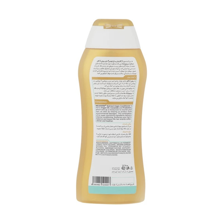 نرم کننده موی سر آرگان نئودرم (Neuderm) حاوی روغن آرگان، پروبیوتیک و سرامید می باشد و رطوبت مورد نیاز مو ها را که به دلایل متعددی از جمله آلاینده های زیست محیطی، مواد فر و رنگ کردن را که از دست می رود را احیا می کند. این ترکیب فوق العاده علاوه بر نرم کنندگی مو ها، به آن ها درخشندگی و براق بودن را نیز هدیه می دهد. روغن آرگان دارای اسید چرب، ویتامین A، ویتامین E و ویتامین C آنتی اکسیدان و لینولئیک اسید بسیار بالایی است. این محصول کاملا ایرانی می باشد و توسط متخصصین با تجربه ایرانی مناسب با آب و هوای کشورمان تولید شده است و می توانید با خیال راحت از آن استفاده نمایید.