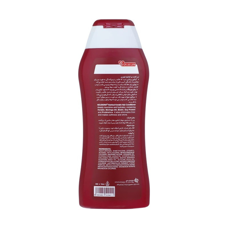 نرم کننده موی کراتینه فاقد سولفات نوتریسل نئودرم حاوی کراتین، روغن مورینگا، بیوتین، پروتئین سویا و پروبیوتیک است. این محصول با تغذیه و آبرسانی عمیق موها، لطافتبخش و بازکننده گره آنها بوده و حالت فر و وزی موها را از بین میبرد و موجب نرمی، لختی، براقی و درخشندگی آنها میشود. نرم کننده کراتینه نئودرم مناسب برای موهای وز، فر، خشک، آسیب دیده و افرادی که موهای خود را به وسیله کراتینه کردن، صاف کردهاند است. کراتین پروتئینی است که به تقویت مو برای جلوگیری از شکستگی، آسیب گرما و وز شدن کمک میکند. این ماده علاوه بر ترمیم کنندگی موها را در برابر آسیبهای محیطی حفظ میکند. بیوتین برای حفظ بافت و قدرت ریشه موها مناسب است. این ماده علاوه بر کمک به رشد مجدد مو، موجب افزایش ضخامت، درخشندگی و کیفیت موها میشود. روغن مورینگا موجود در نرم کننده کراتینه فاقد سولفات نئودرم، سرشار از ماده معدنی روی است که به تولید کراتین و در نهایت، تقویت موها کمک شایانی میکند. این روغن ارزشمند علاوه بر خاصیت ضد التهابی، دارای خواص محافظتی و مرطوبکنندگی قوی است. پروتئین سویا به بهبود بافت مو، تقویت و ترمیم موهای آسیب دیده کمک میکند و موجب میشود موها مرطوب، براق و سالم باشند. ویتامین B نقش مهمی در حفظ سلامتی و رشد موها دارد و با جلوگیری از آسیبهای ناشی از رادیکالهای آزاد، به بهبود سلامت آن کمک میکند. پروبیوتیکها همانند واکسن، سیستم ایمنى سلولى را فعال کرده و ضمن تولید مواد ضد التهابى، با حفظ اسیدیته پوست و مو به بهبود وضعیت آنها کمک میکند.